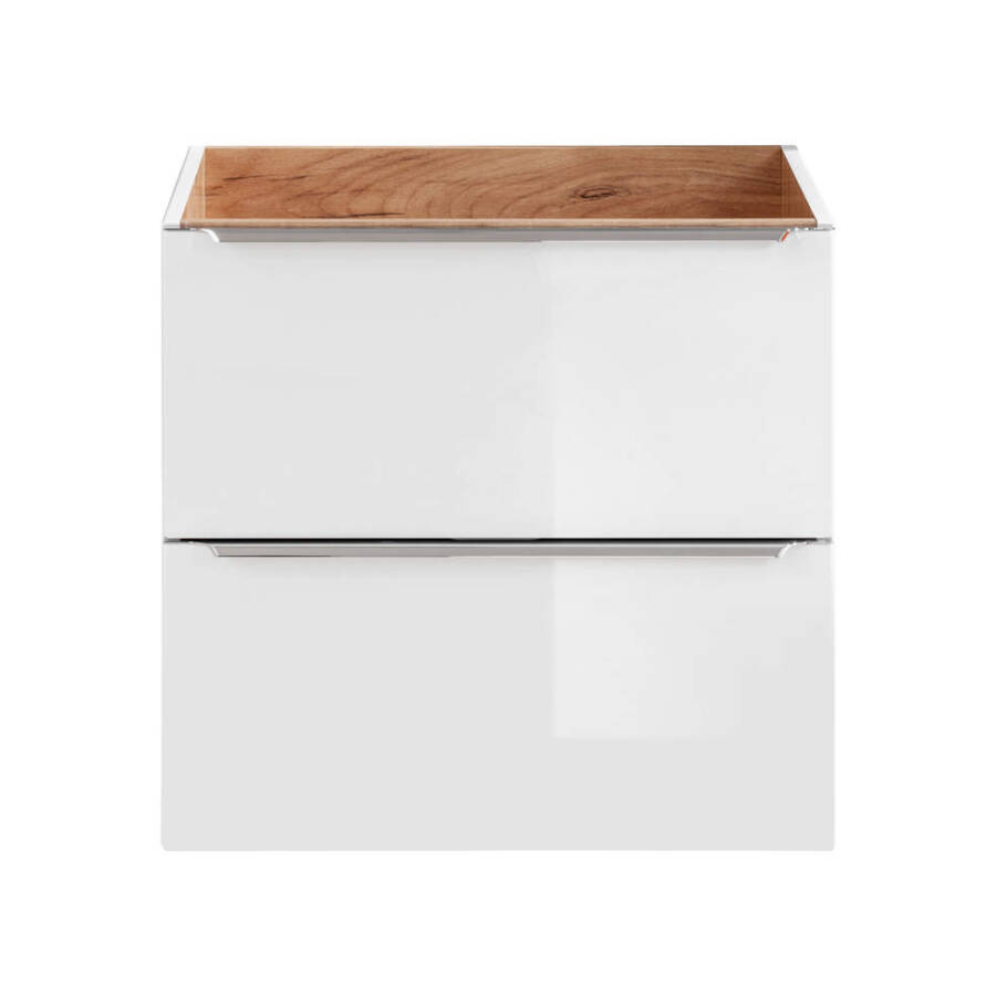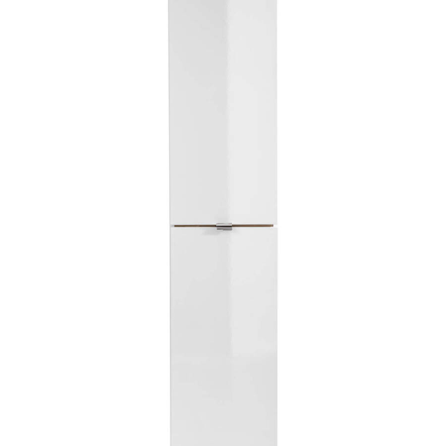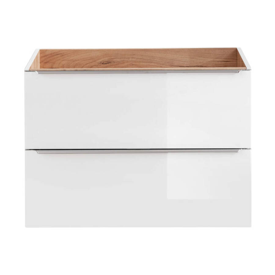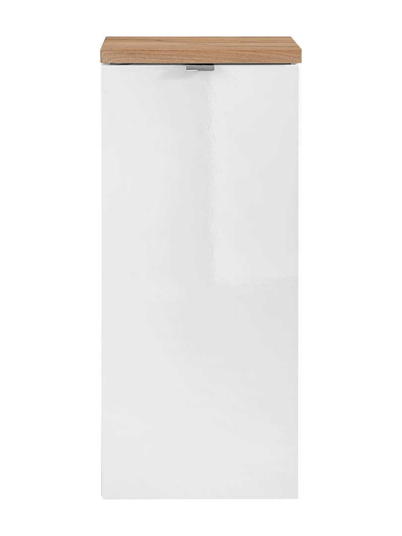 Meble łazienkowe Capri Biały to nowoczesna kolekcja białych mebli łazienkowych z połyskiem, stworzona do jasnych i eleganckich aranżacji wnętrz. Białe fronty w połączeniu z naturalnym dekorem drewna optycznie powiększają przestrzeń i nadają łazience świeży, uporządkowany wygląd.