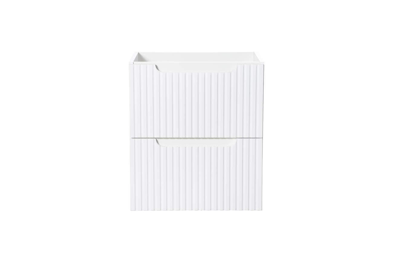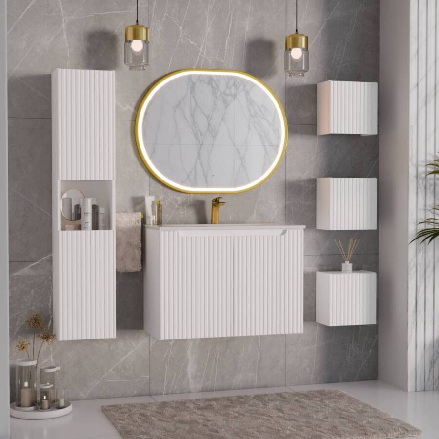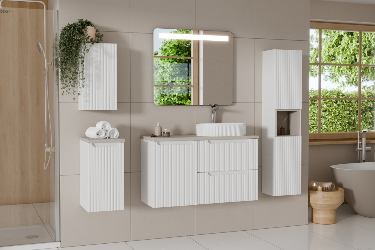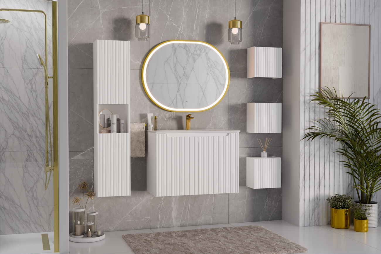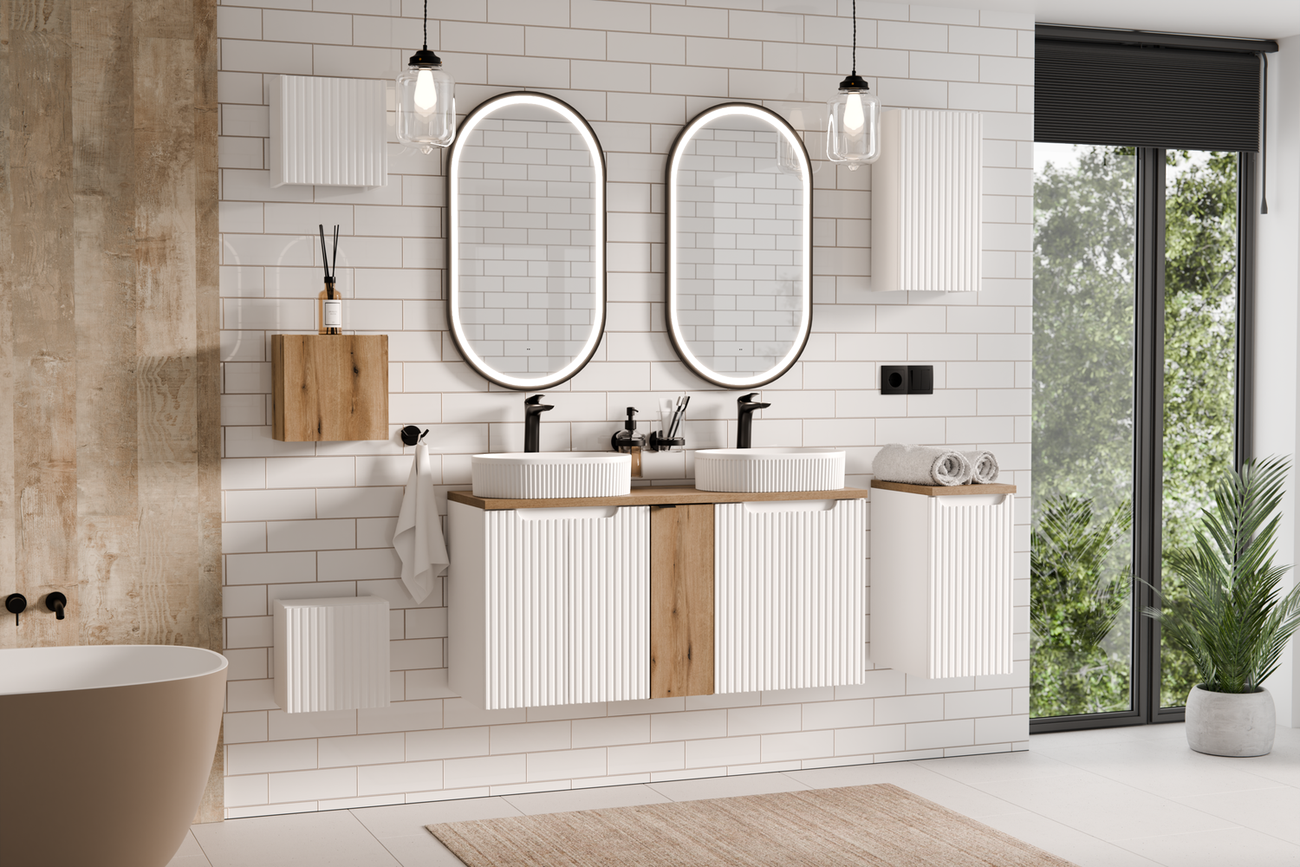 Meble łazienkowe Nova Biały to nowoczesna kolekcja białych mebli łazienkowych z eleganckim, pionowym frezowaniem frontów, stworzona do jasnych i stylowych wnętrz. Białe meble łazienkowe Nova w połączeniu z naturalnym dekorem drewna optycznie powiększają przestrzeń i nadają łazience świeży, uporządkowany oraz nowoczesny charakter.