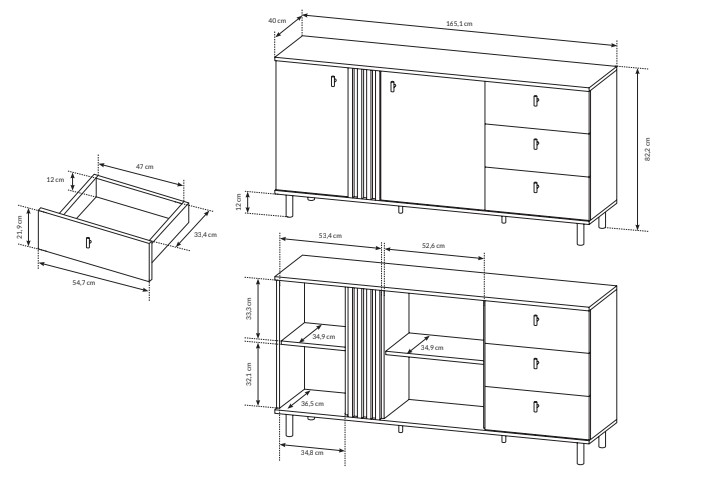 Ozdobne lamele w antracytowym kolorze dodają meblowi charakteru, a metalowe uchwyty i nóżki podkreślają nowoczesny wygląd. Dzięki praktycznemu układowi półek i szuflad, komoda oferuje dużo miejsca na przechowywanie.