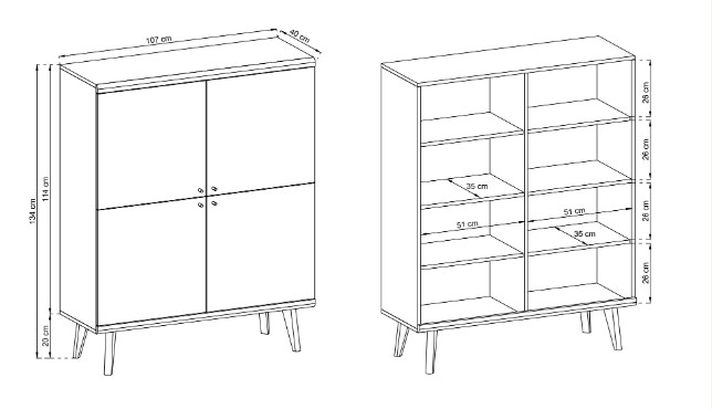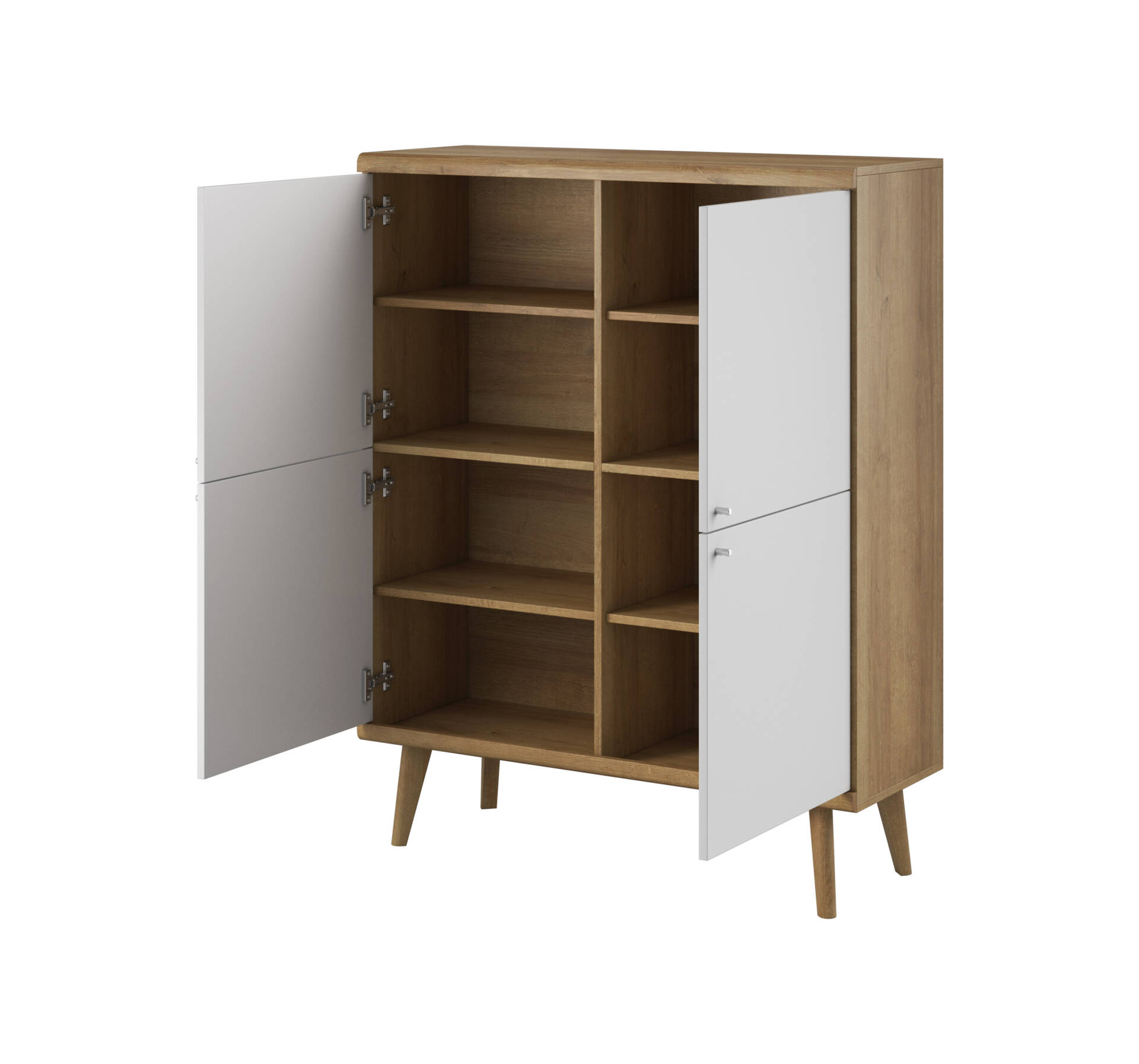 Komoda oferuje cztery pojemne drzwi, za którymi znajdują się przestronne półki, zapewniając dużo miejsca do przechowywania różnych przedmiotów. Dzięki swojej wysokości i szerokości komoda jest idealna zarówno do przechowywania ubrań, jak i dokumentów czy innych akcesoriów.