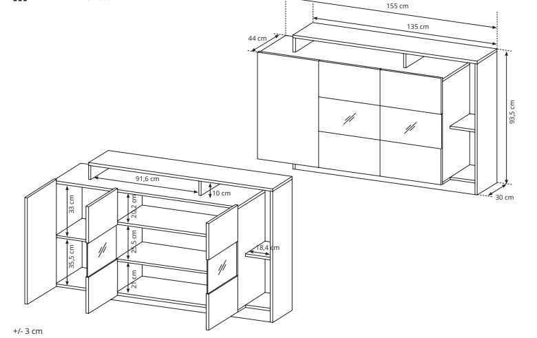 • Wymiary: Wysokość: 93,5 cm, Szerokość: 155 cm, Głębokość: 44 cm – zapewniają optymalną przestrzeń do przechowywania i eksponowania dekoracji.