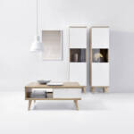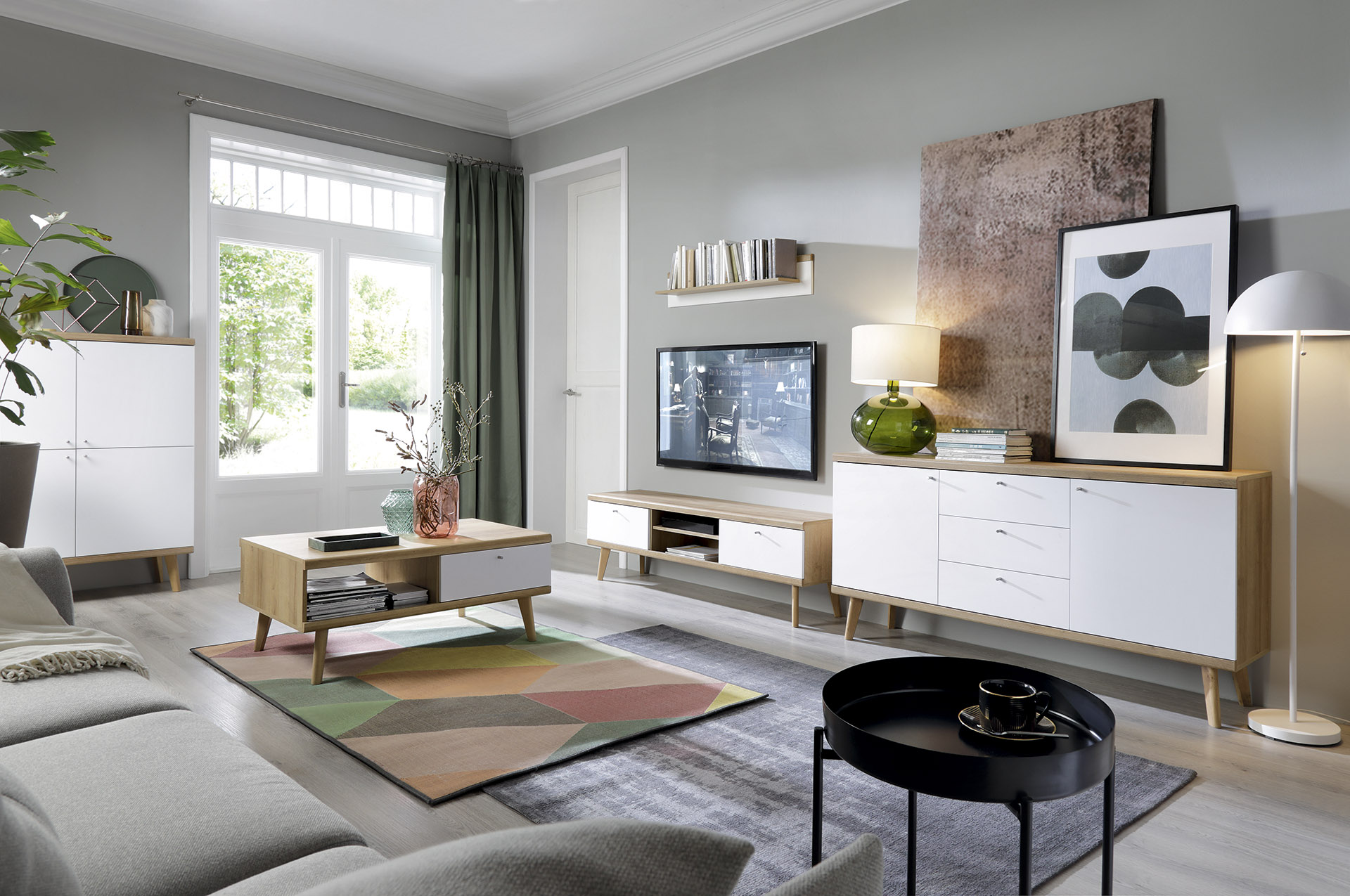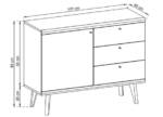 Fronty w kolorze białego matu w połączeniu z blatem w odcieniu dębu riviera tworzą harmonijną całość, która doskonale wkomponuje się zarówno w nowoczesne, jak i klasyczne wnętrza. Komoda jest wyposażona w trzy pojemne szuflady oraz jedną szafkę, co zapewnia dużo miejsca na przechowywanie różnych przedmiotów.