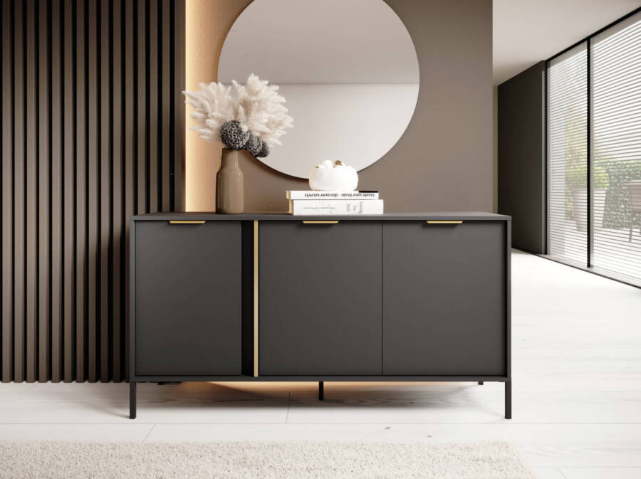 Stylowa i funkcjonalna komoda w kolorze antracytowym to doskonały wybór dla osób ceniących nowoczesne i eleganckie rozwiązania. Dzięki minimalistycznemu designowi i złotym metalowym uchwytom, mebel idealnie komponuje się z nowoczesnymi aranżacjami, wnosząc do wnętrza luksusowy akcent.