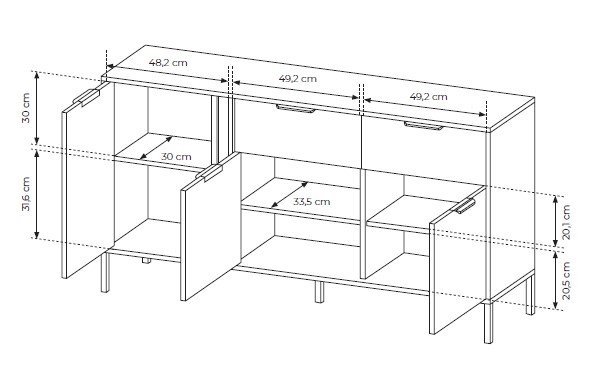 - Przestrzeń do przechowywania: Komoda posiada trzy zamykane szafki oraz dwie pojemne szuflady, które pomogą w utrzymaniu porządku w domu