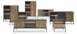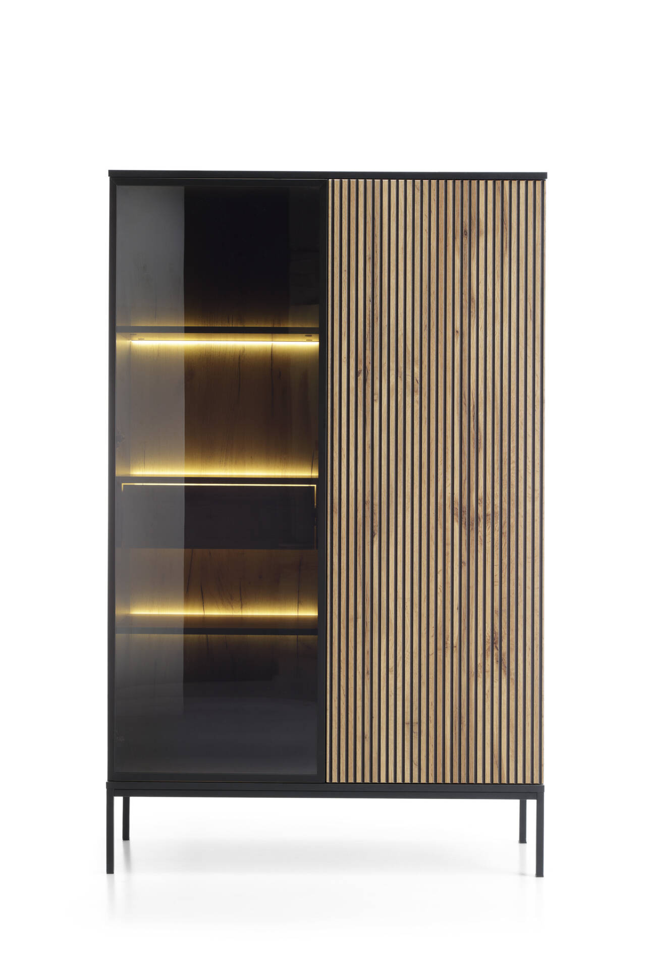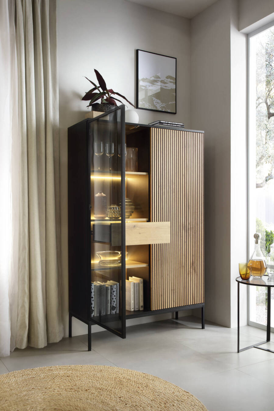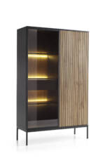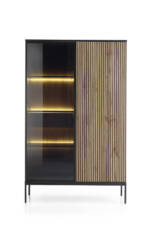 Metalowa rama w czarnym kolorze dodaje meblowi nowoczesnego wyglądu, a subtelne drewniane akcenty wprowadzają ciepło do wnętrza. Witryna jest nie tylko estetyczna, ale również praktyczna – doskonała do przechowywania książek, szkła, dekoracji i innych drobiazgów.