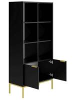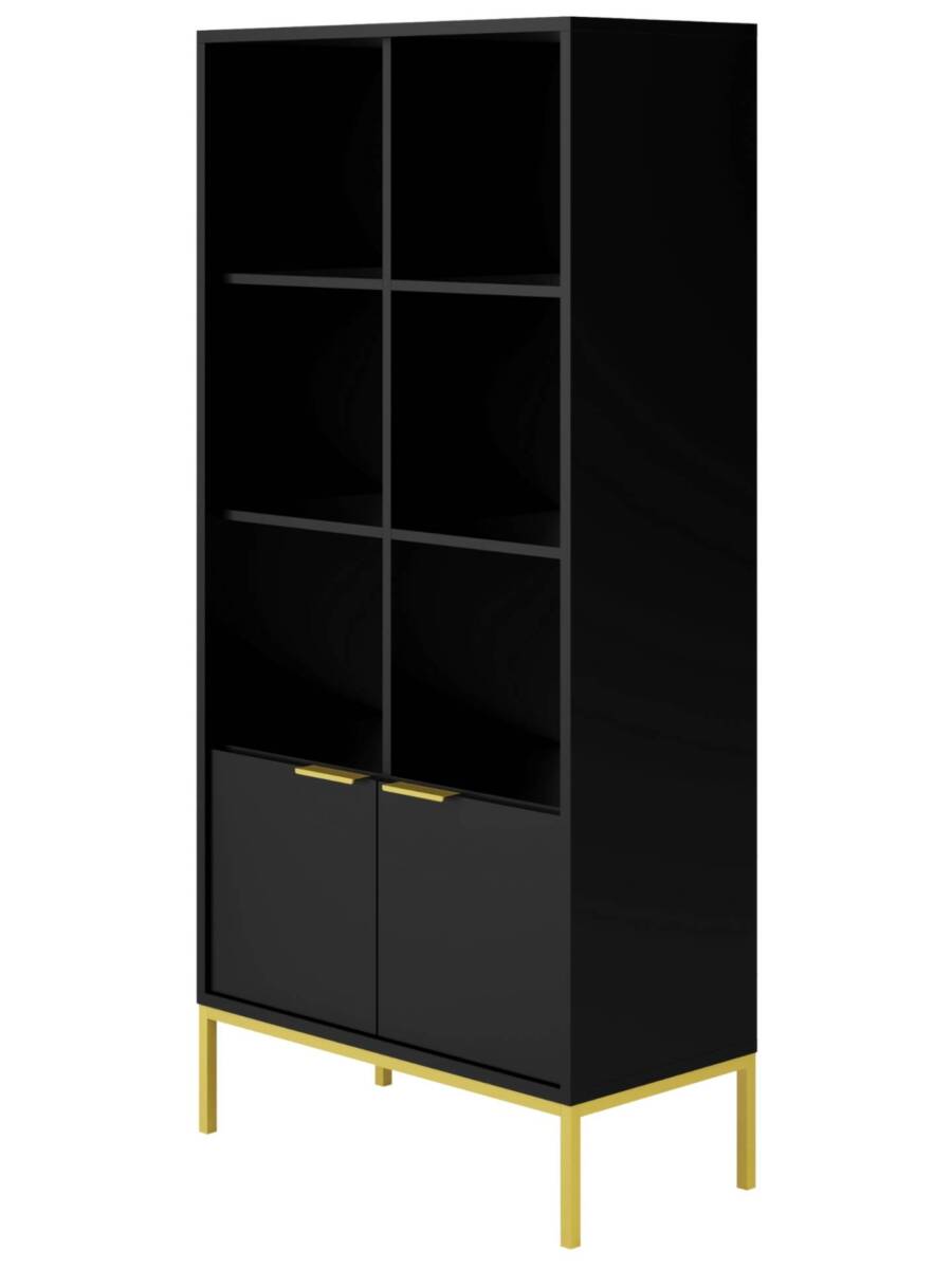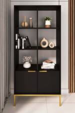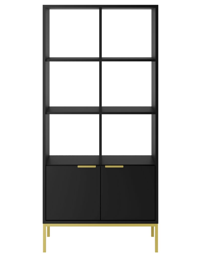 Regał czarny ze złotymi nóżkami nowoczesny – 6 półek i szafki dolne