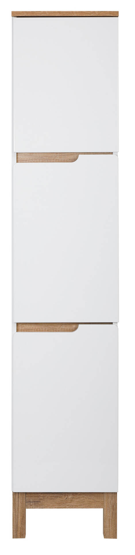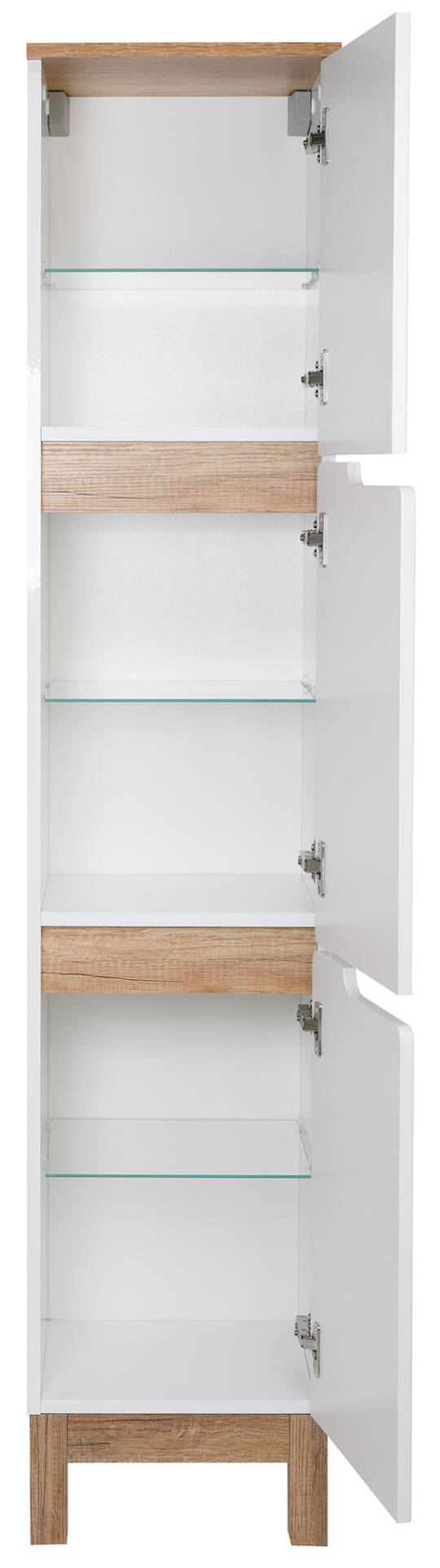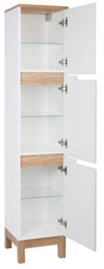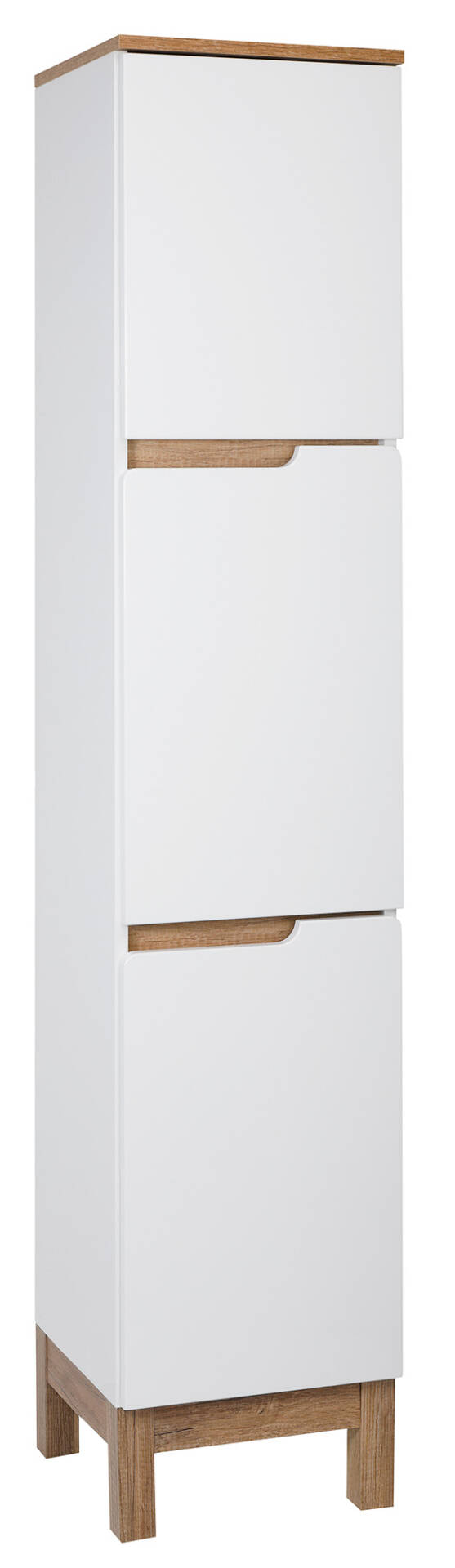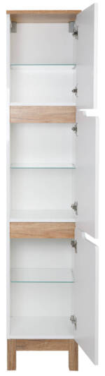 Słupek łazienkowy o szerokości 35 cm to połączenie minimalistycznego stylu z wyjątkową funkcjonalnością. Mebel został zaprojektowany tak, aby maksymalnie wykorzystać przestrzeń w łazience, zapewniając wygodne przechowywanie kosmetyków, ręczników i innych akcesoriów. Dzięki eleganckiemu wykończeniu w białym połysku i detalom w kolorze drewna, słupek doskonale wpisuje się w aktualne trendy aranżacyjne.