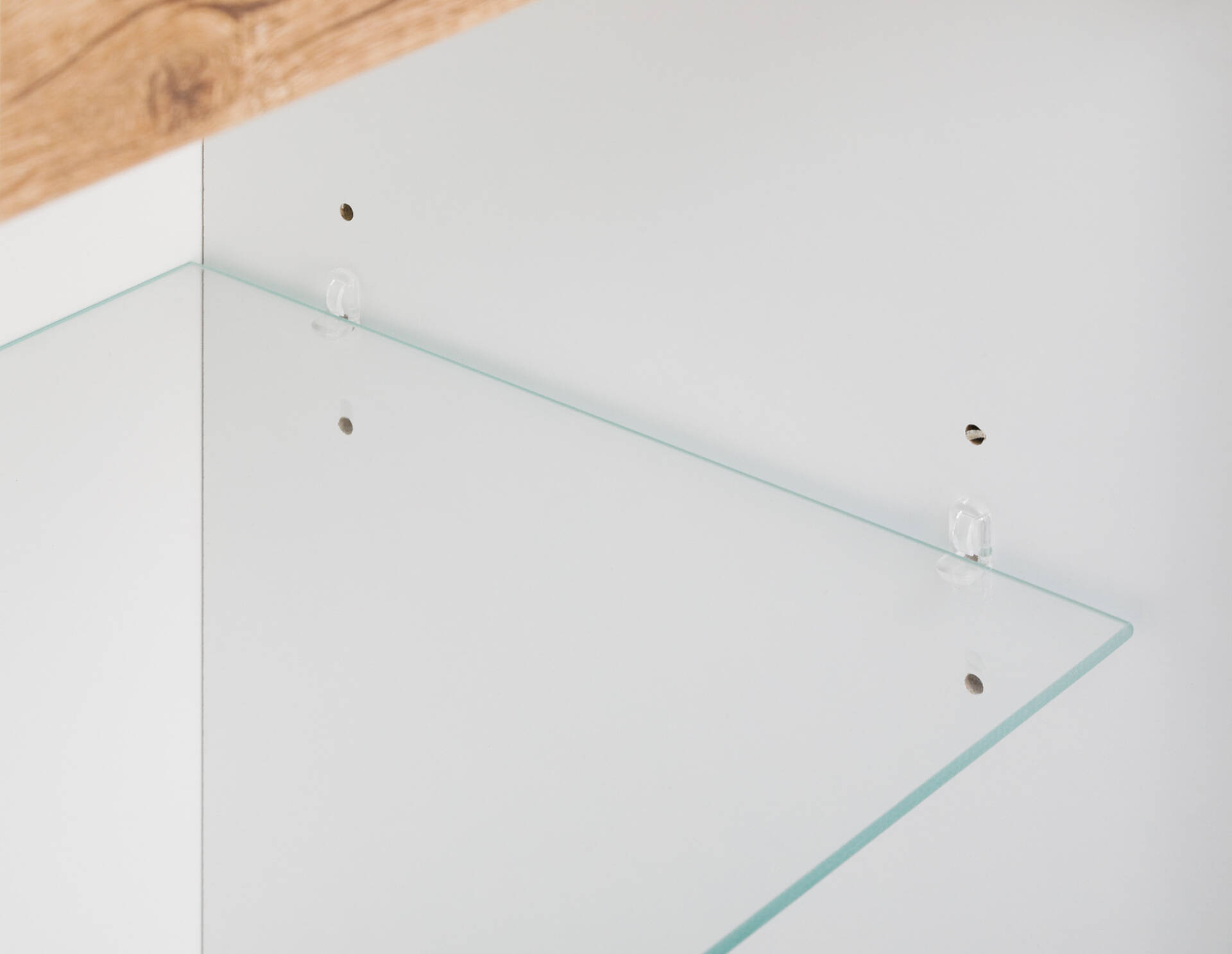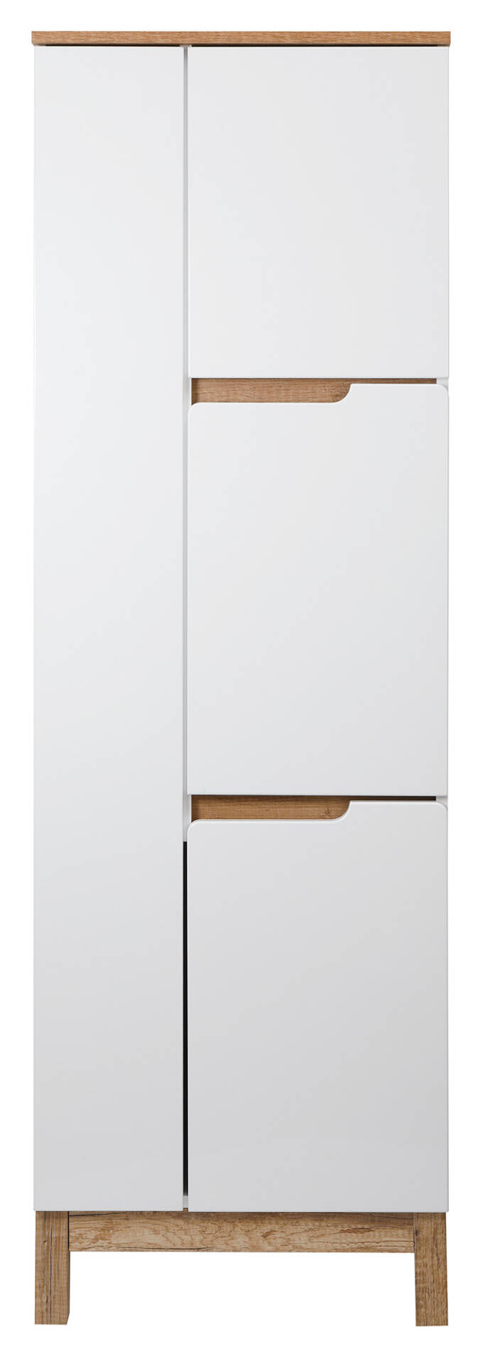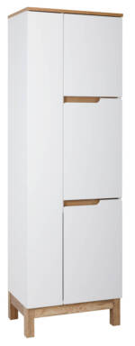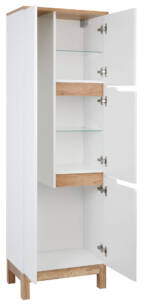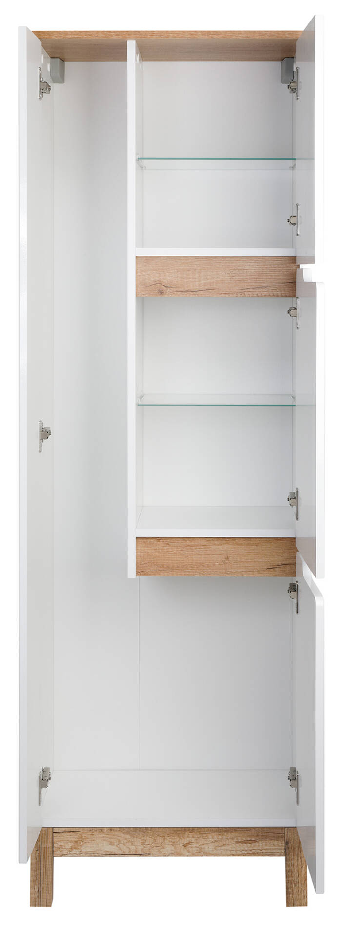 Słupek łazienkowy o szerokości 55 cm został zaprojektowany z myślą o maksymalnej funkcjonalności i estetyce. Posiada cztery pojemne drzwi oraz dwie szklane półki z regulacją wysokości, które pozwalają na wygodne rozmieszczenie niezbędnych akcesoriów. Dodatkowo wewnątrz mebla znajduje się specjalnie zaprojektowana przestrzeń do przechowywania mopa – praktyczne i eleganckie rozwiązanie, które pomaga utrzymać porządek w łazience.