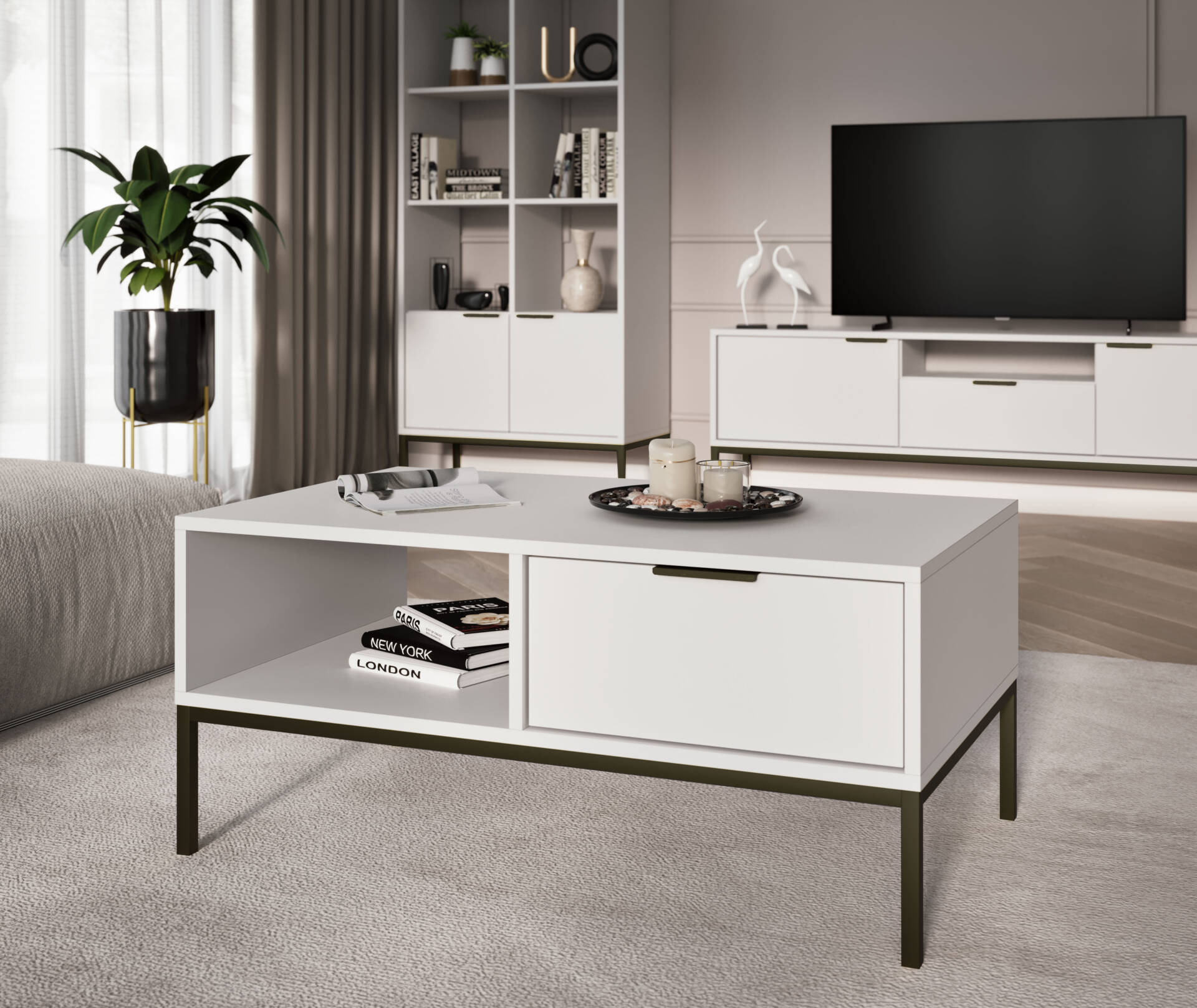 ✨ Stolik kawowy Austin 80 cm w kolorze białym z czanym stelażem to elegancki i funkcjonalny mebel do salonu, który łączy nowoczesny design z praktycznością. Na innych aukcjach dostępne są także inne kolory mebla i stelaża: biały, czarny, kaszmir ze złotym lub czarnym stelażem. W kolekcji Austin znajdziesz również regał, komodę, szafkę RTV, szafkę nocną oraz szafę, które pozwolą Ci stworzyć spójne i stylowe wnętrze.