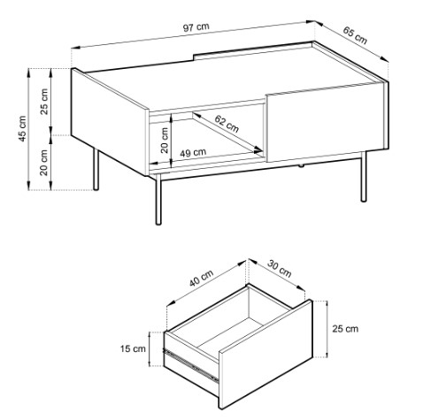 Stolik kawowy jest wyposażony w przestronną szufladę, która oferuje dodatkowe miejsce do przechowywania pilotów, czasopism czy innych drobiazgów. Dodatkowo, otwarta półka pod blatem to idealne miejsce na książki, dekoracje lub inne przedmioty, które chcesz mieć pod ręką. Smukłe metalowe nóżki nadają meblowi lekkości i nowoczesnego wyglądu, jednocześnie zapewniając jego stabilność.