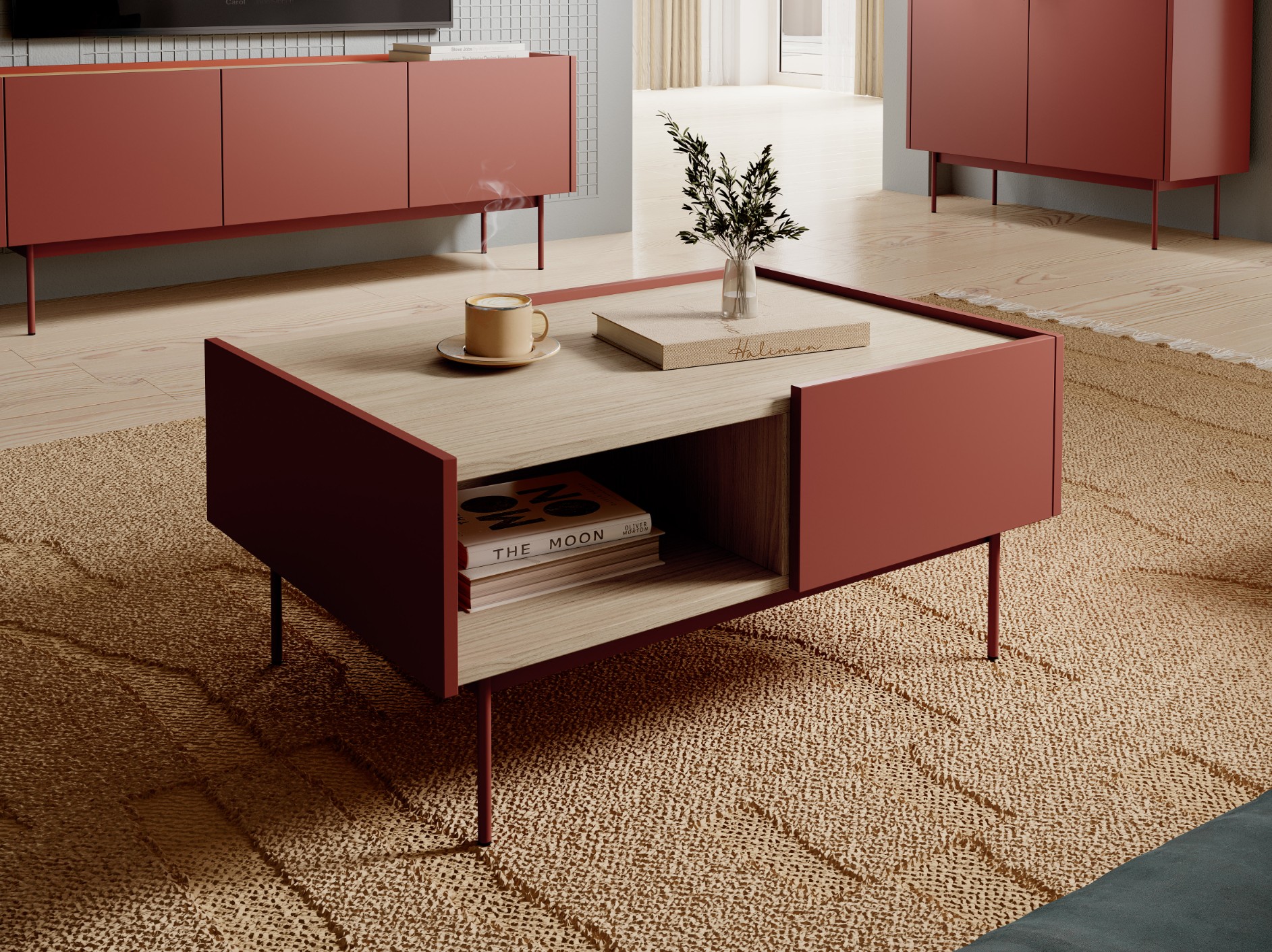 Przedstawiamy nowoczesny stolik kawowy, który doskonale łączy funkcjonalność z eleganckim designem. Ten stylowy mebel o wymiarach 45 cm wysokości, 97 cm szerokości oraz 65 cm głębokości został wykonany z wysokiej jakości płyty laminowanej, co zapewnia jego trwałość oraz odporność na codzienne użytkowanie. Blat w kolorze dąb linea harmonijnie komponuje się z frontem w odcieniu czerwonym, tworząc ciepły i nowoczesny akcent w Twoim wnętrzu.