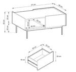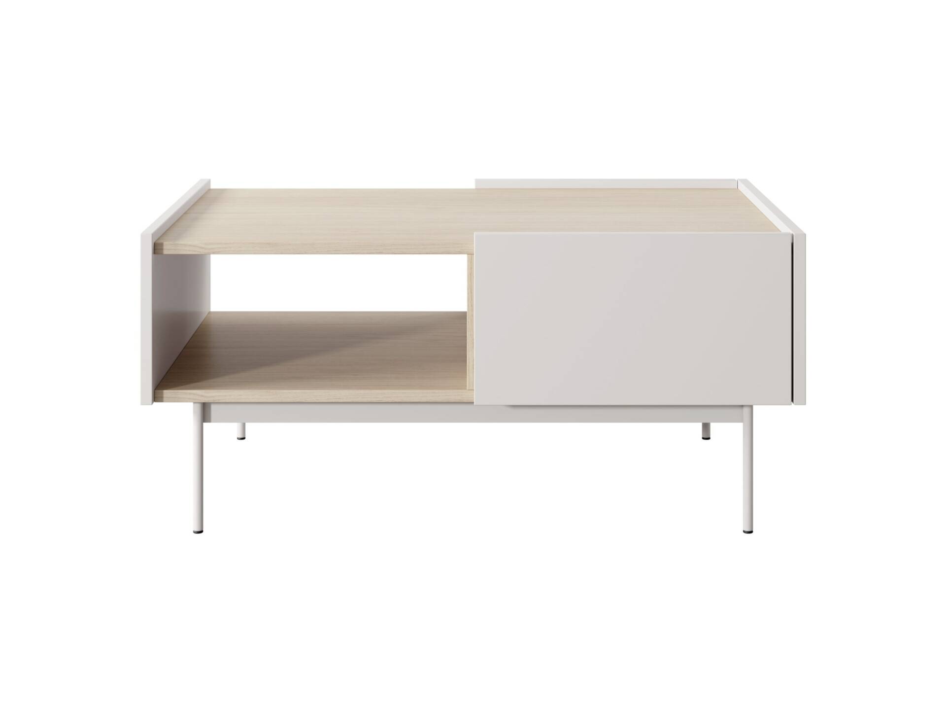 Stolik kawowy jest wyposażony w przestronną szufladę, która oferuje dodatkowe miejsce do przechowywania pilotów, czasopism czy innych drobiazgów. Dodatkowo, otwarta półka pod blatem to idealne miejsce na książki, dekoracje lub inne przedmioty, które chcesz mieć pod ręką. Smukłe metalowe nóżki nadają meblowi lekkości i nowoczesnego wyglądu, jednocześnie zapewniając jego stabilność.