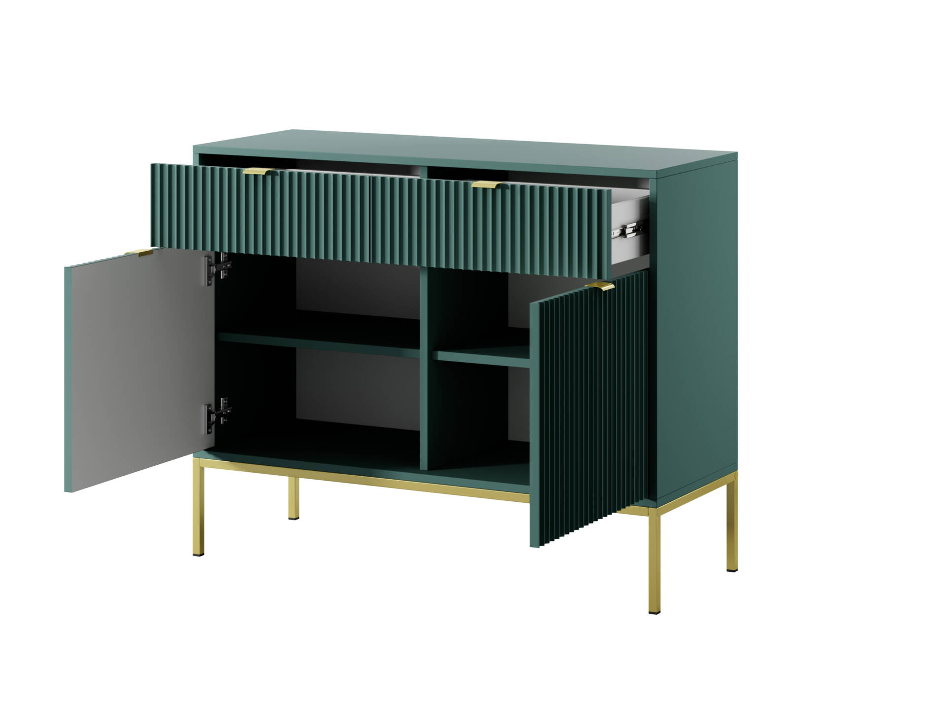 Dodaj swojemu wnętrzu nutę wyrafinowanego stylu dzięki nowoczesnej komodzie w kolorze butelkowej zieleni ze złotym stelażem. Ten wyjątkowy mebel o wymiarach 104x39x83 cm łączy w sobie elegancki design i wysoką funkcjonalność. Doskonale sprawdzi się w salonie, sypialni, biurze czy przedpokoju, dodając im luksusowego charakteru i ponadczasowego stylu.