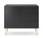 Prezentujemy nowoczesną i elegancką szafkę, która stanie się ozdobą każdego wnętrza. Mebel wykonany jest z wysokiej jakości płyty laminowanej, co gwarantuje jego trwałość i odporność na uszkodzenia. Klasyczny, czarny grafitowy kolor szafki w połączeniu ze złotymi nóżkami tworzy wyjątkowy efekt, który doskonale wpisuje się w nowoczesne trendy aranżacyjne, szczególnie w stylu loftowym.
