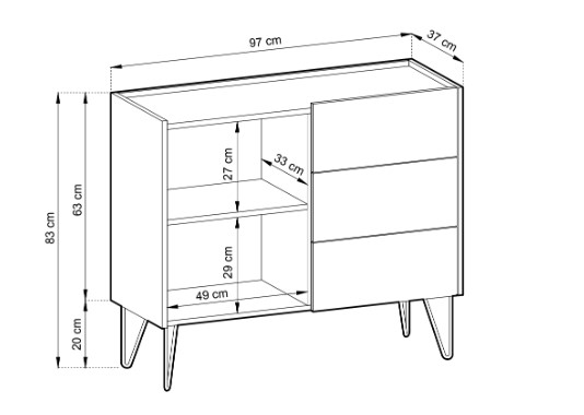 Szafka jest nie tylko stylowa, ale także niezwykle funkcjonalna. Wyposażona w trzy pojemne szuflady oraz jedną szafkę z półką, oferuje mnóstwo miejsca na przechowywanie różnorodnych przedmiotów – od dokumentów, przez tekstylia, po dekoracje. Idealna do salonu, sypialni, przedpokoju czy biura.