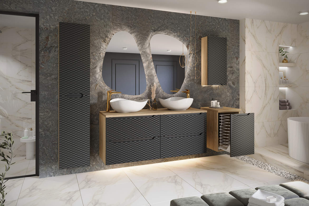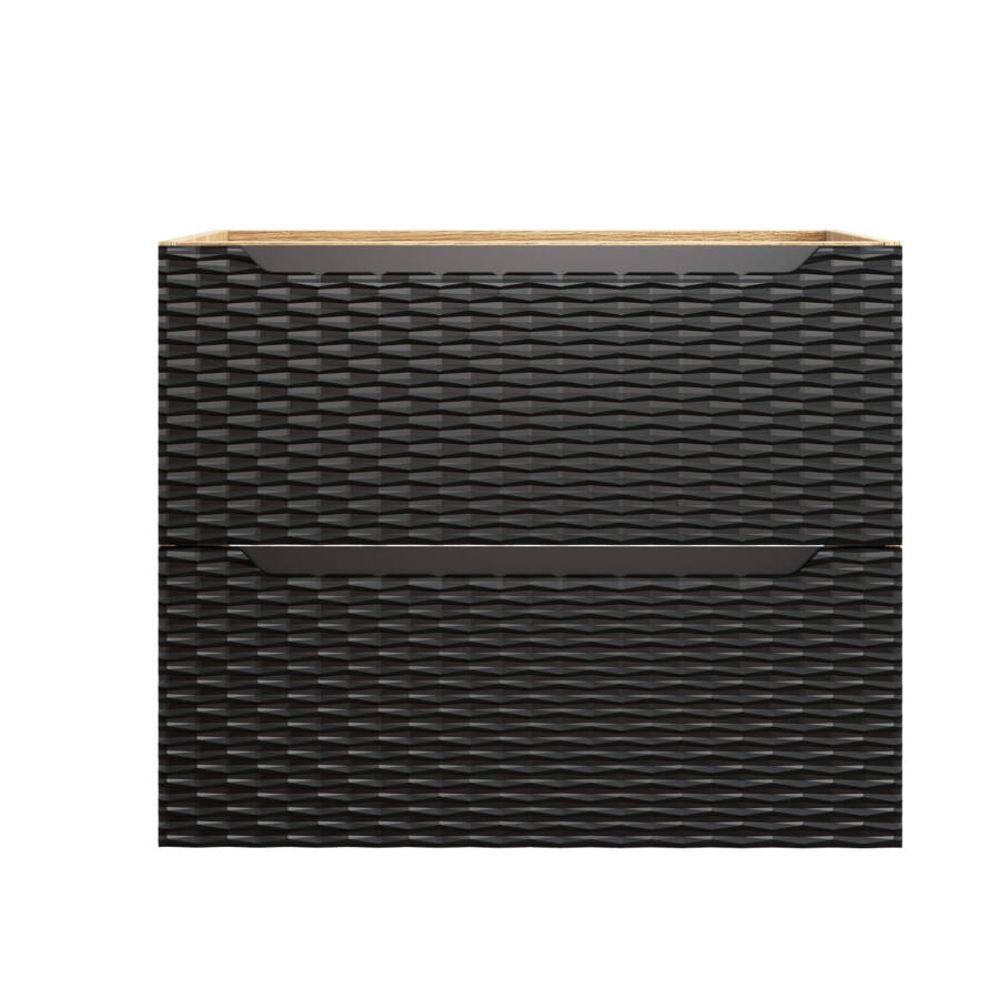 ✨ Stylowa szafka łazienkowa pod umywalkę o szerokości 70 cm z dwiema pojemnymi szufladami, w eleganckim połączeniu czarnego matu i dębu olejowanego. Front 3D dodaje nowoczesności i unikalnego designu każdemu wnętrzu.