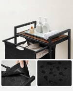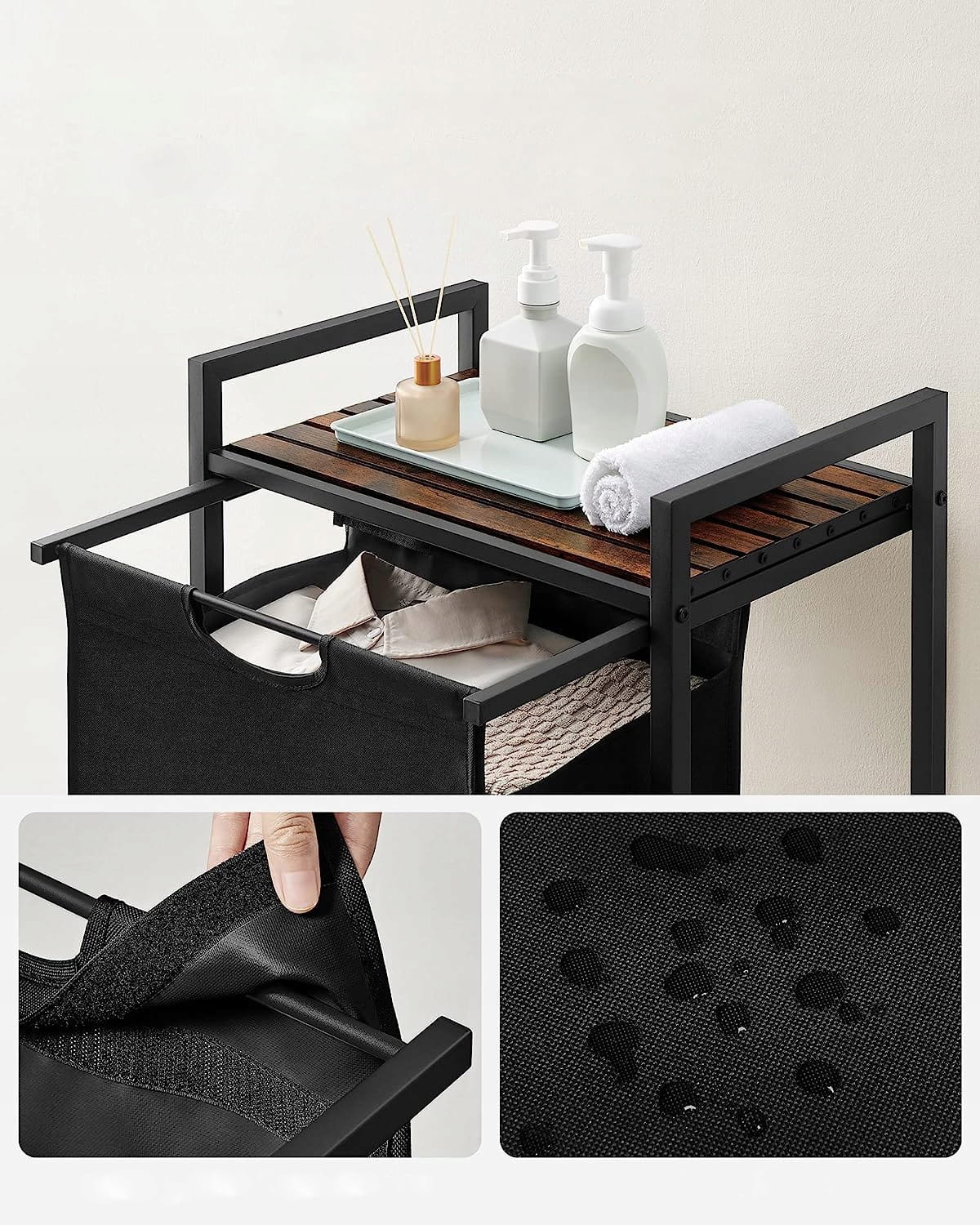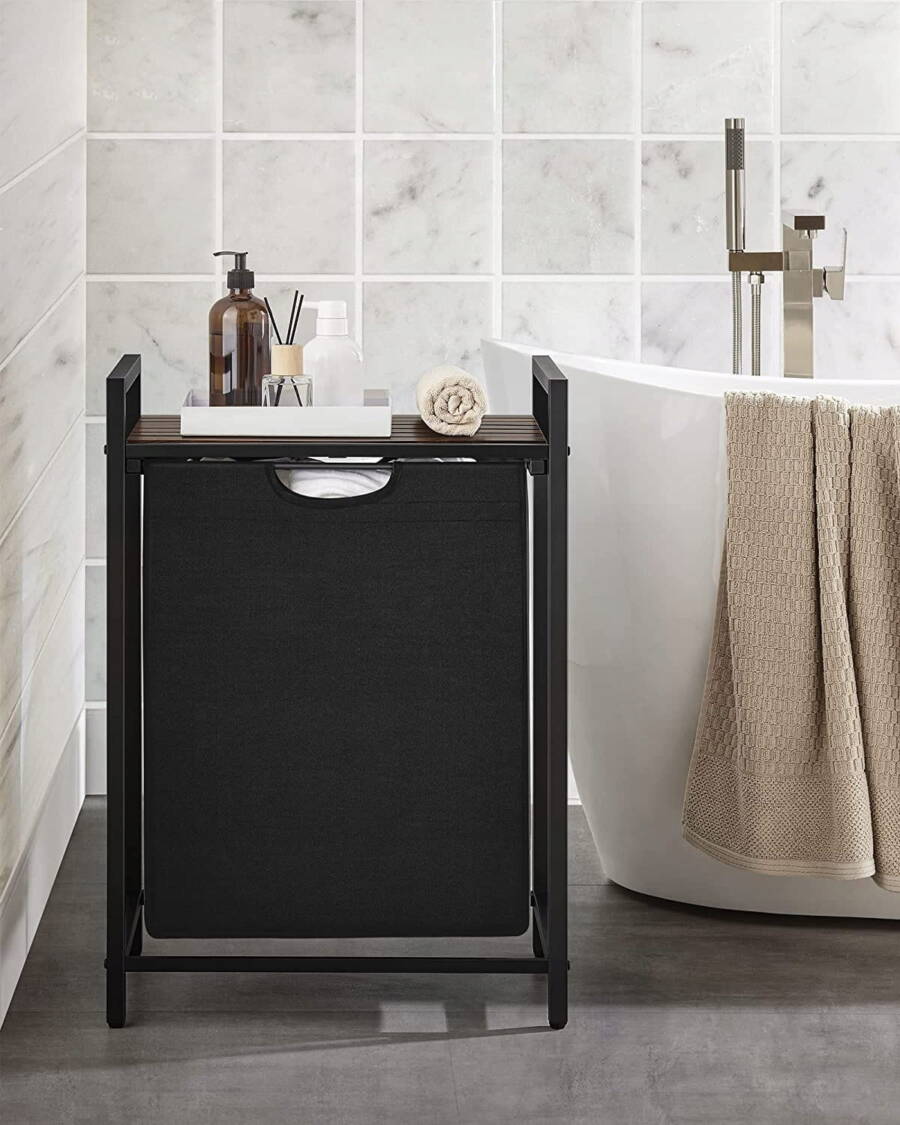 Dodaj funkcjonalność i styl do swojej łazienki z tą praktyczną szafką łazienkową z koszem na pranie. Wykonana z wysokiej jakości materiałów – blat z płyty MDF w rustykalnym brązowym kolorze, stalowy stelaż oraz wytrzymała tkanina Oxford, szafka jest trwała i estetyczna. Przestronny kosz ułatwia segregację prania, a blat oferuje dodatkową powierzchnię do przechowywania akcesoriów łazienkowych.