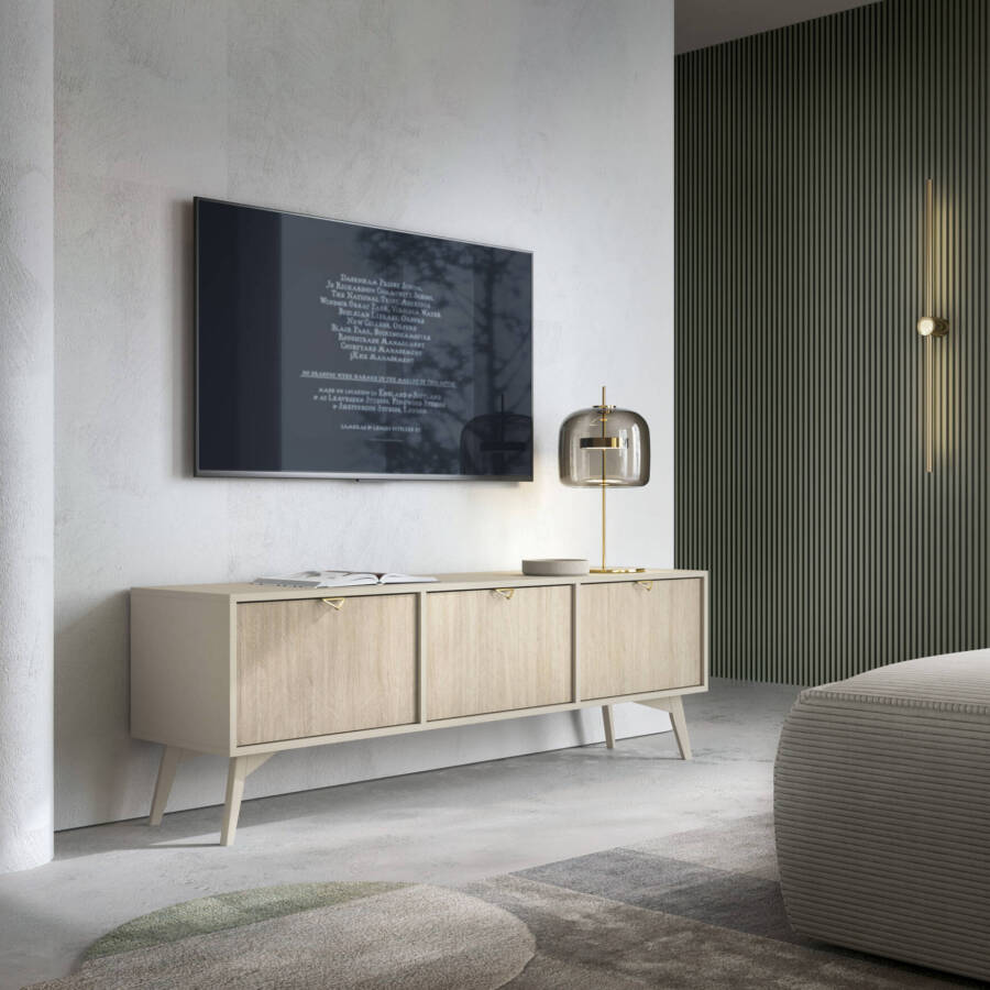 Szafka RTV 160 cm szara z blatem dąb nowoczesna elegancka na nóżkach