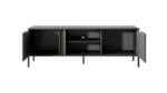 Nowoczesna szafka RTV w kolorze antracytowym to doskonały wybór dla osób ceniących minimalistyczny styl i elegancję. Złote metalowe uchwyty podkreślają jej luksusowy charakter, a praktyczne rozwiązania sprawiają, że jest idealnym meblem do salonu. Otwarta przestrzeń na sprzęt multimedialny z otworem na kable zapewnia estetyczne i funkcjonalne użytkowanie.