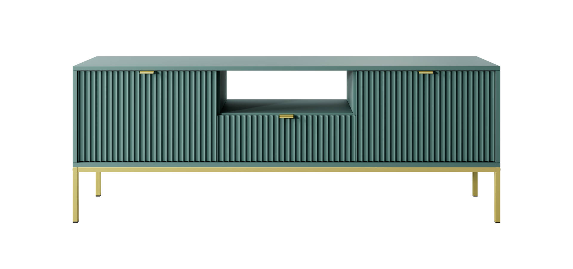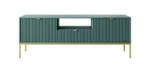 Odmień swoje wnętrze dzięki nowoczesnej szafce RTV w kolorze butelkowej zieleni ze złotym stelażem. To wyjątkowe zestawienie głębokiej zieleni i złotych detali wprowadza do pomieszczenia elegancję i wyjątkowy charakter. Szafka o wymiarach 154x39x56 cm została zaprojektowana tak, aby łączyć estetykę z praktycznością – idealna do przechowywania sprzętu RTV, książek, konsol i dekoracji.