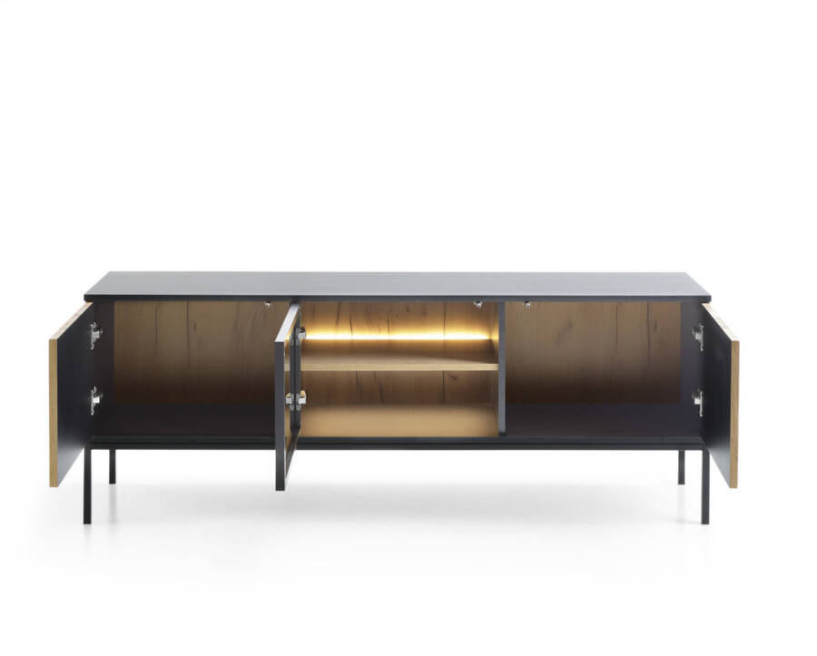 Odkryj nowoczesną szafkę RTV, która doskonale łączy funkcjonalność z elegancją. Dzięki wymiarom 153,4 cm szerokości, 56,2 cm wysokości i 39 cm głębokości, ta szafka RTV zapewnia nie tylko wystarczająco dużo miejsca na Twój sprzęt audio-wideo, ale również dodaje wnętrzu wyjątkowego charakteru. Wykonana z najwyższej jakości materiałów, szafka posiada piękne fronty z naturalnym wykończeniem w stylu industrialnym, które wspaniale kontrastują z subtelnym podświetleniem LED.
