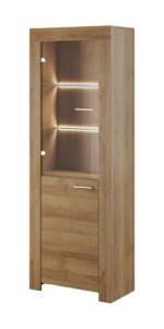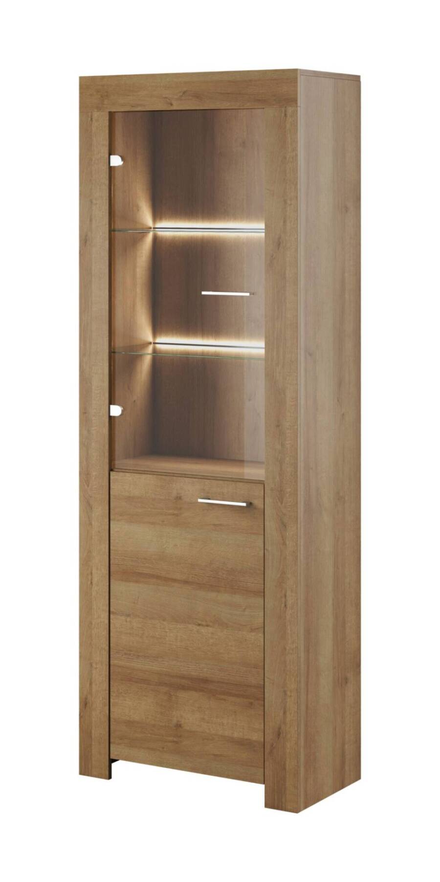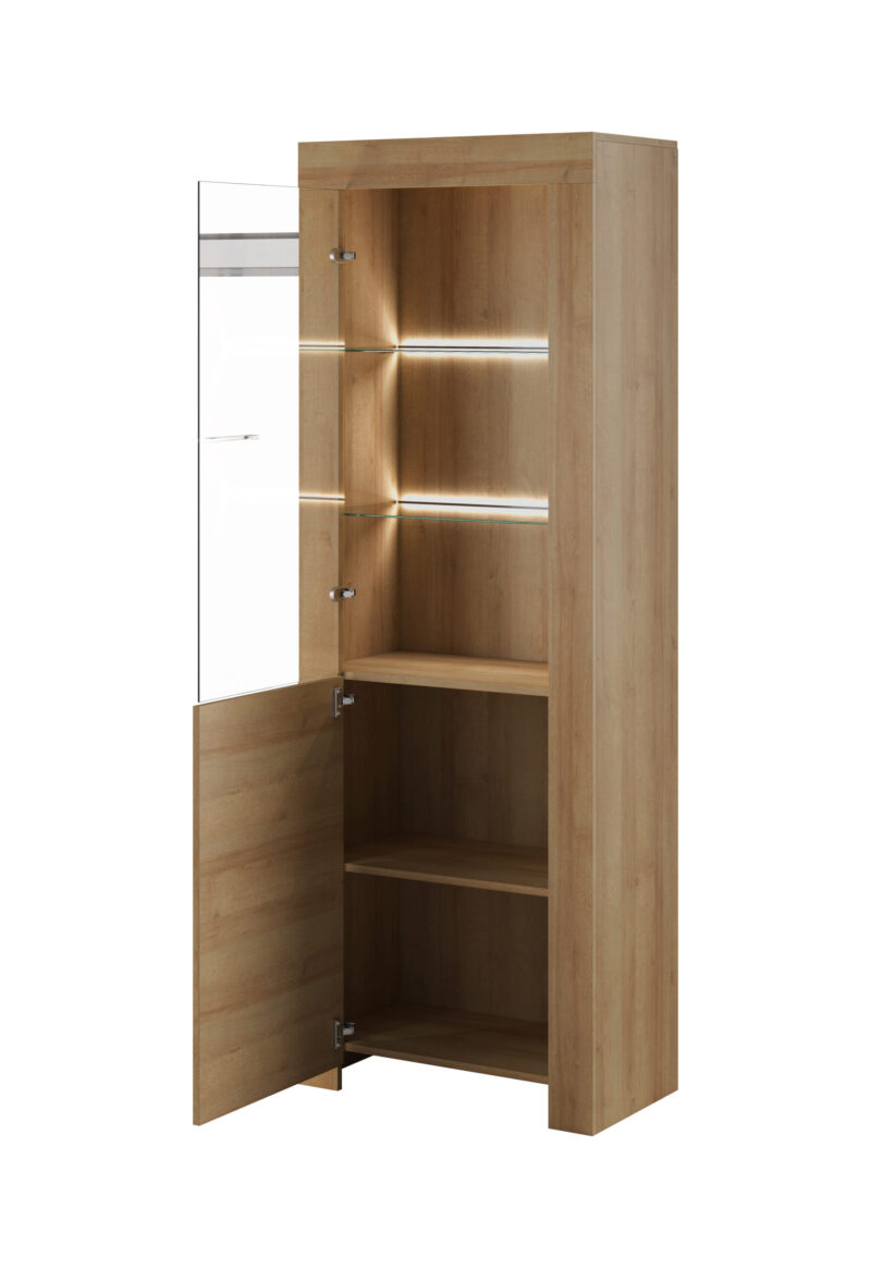 Odkryj wyjątkowy styl i funkcjonalność z naszą witryną szklaną wykonaną z najwyższej jakości płyty laminowanej w kolorze dąb riviera. Ten elegancki mebel o nowoczesnym designie doskonale wpasuje się w każdy salon, dodając mu klasy i ciepła. Witryna posiada przeszklone fronty, które eksponują wnętrze z trzema półkami, idealnymi do prezentowania ulubionych dekoracji, książek czy zastawy stołowej.