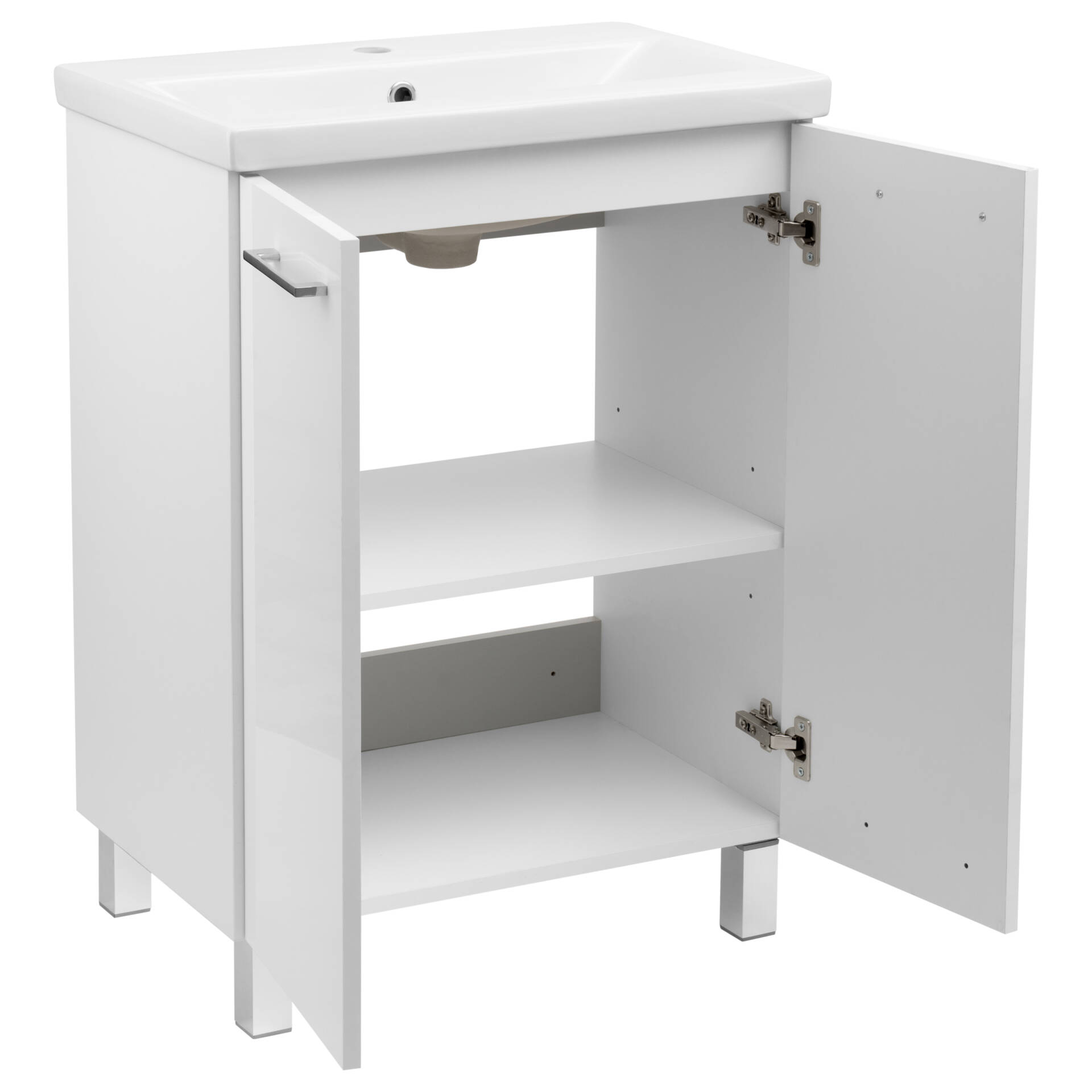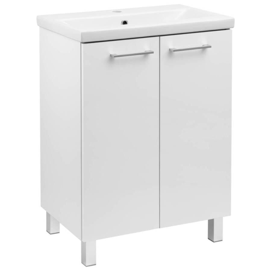Zestaw o szerokości 60 cm to nowoczesne i wygodne połączenie ceramicznej umywalki z szafką stojącą na czterech chromowanych nogach. Umywalka posiada obszerną miskę oraz praktyczną powierzchnię odkładczą na kosmetyki i przybory toaletowe, a szafka wyposażona jest w dwoje drzwi z systemem cichego domykania, co zapewnia komfort codziennego użytkowania.